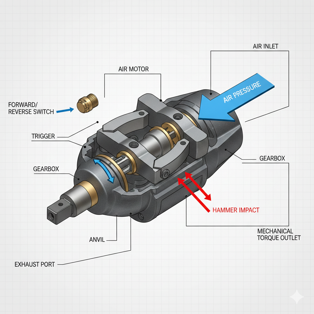 Inti dari a kunci pas dampak pneumatik adalah motor udaranya. Saat pengguna menarik pelatuk, udara bertekanan masuk ke alat dan memutar rotor. Rotor ini terhubung ke "mekanisme tumbukan"—biasanya desain palu ganda atau anjing goyang. Saat rotor berputar, ia menghasilkan energi kinetik. Ketika ketahanan baut menjadi lebih tinggi dari gaya putaran motor, palu internal akan memukul poros keluaran (landasan), menghasilkan ledakan gaya rotasi yang sangat besar dan tiba-tiba. Hal ini terjadi ratusan atau bahkan ribuan kali per menit.